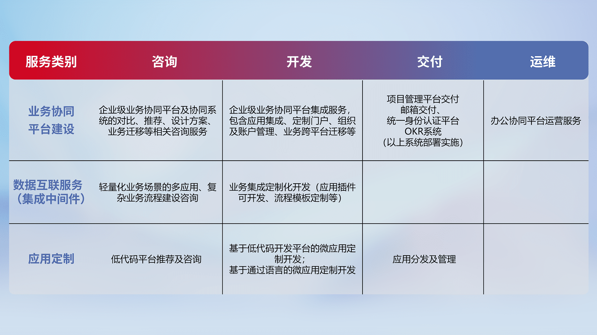 针对钉钉、、、企微、、IDaas等平台级产品提供产品的规划、、方案、、交付、、定制化开发等服务,,实现如统一协同办公、、智能客户服务、、混合会议管理、、、智能数据查询、、、等业务场景,,,实现数字化转型。。。。