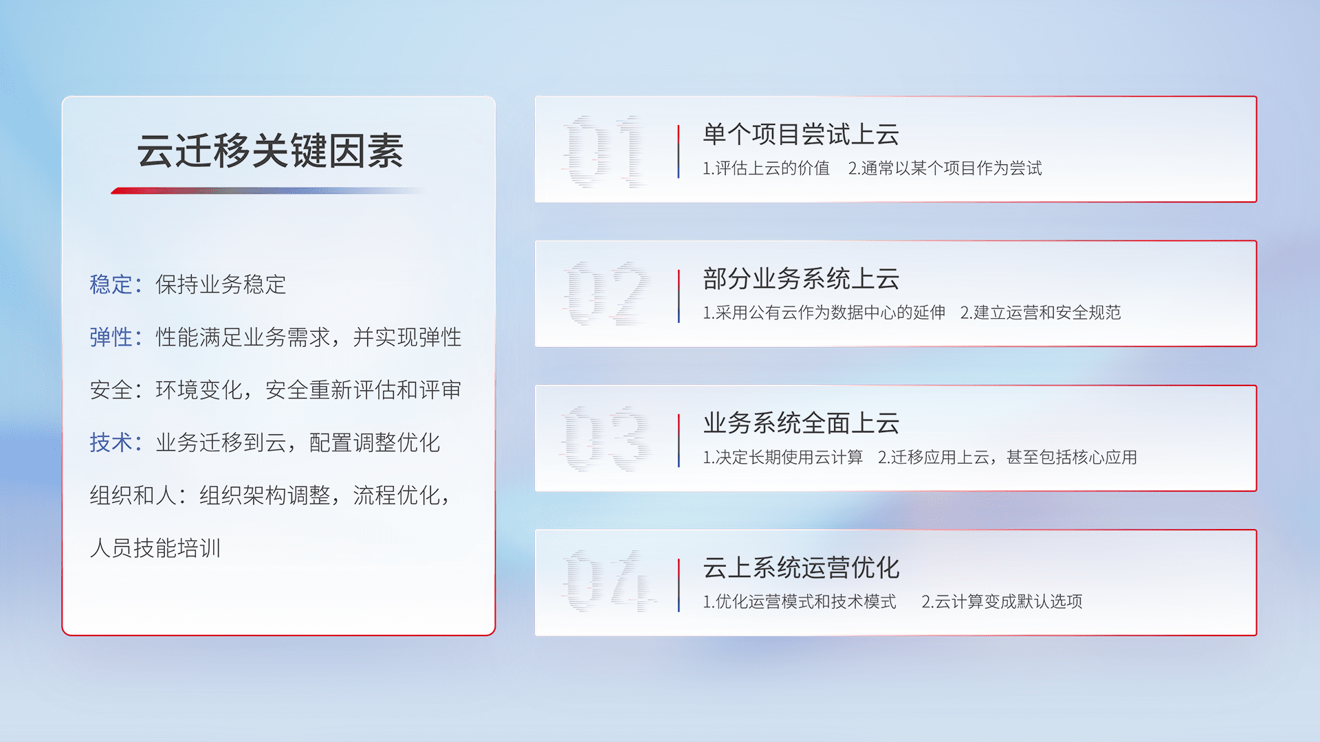 结合实际业务,,,,从规划设计、、云平台选型、、、云原生改造、、、数据迁移、、、、集成交付,,迁移全过程为客户识别最佳上云路径,,,做好风险识别管理,,,,设计网络架构、、、、身份权限、、、、安全审计合规、、、操作审计、、、日志审计、、、、监控告警策略、、、多站点容灾设计等,,,,对云上基础设施进行整体规划,,提升IT治理水平,,以满足弹性、、高可用、、、、高性能的需求。。。。