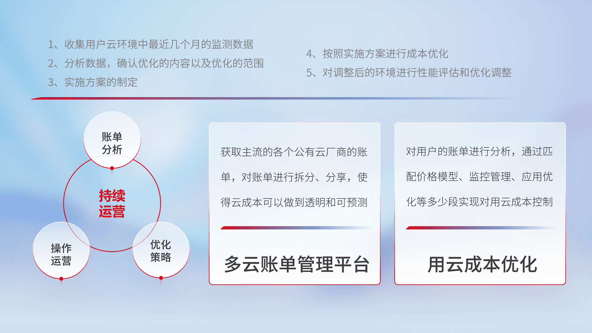 通过多云纳管,,以统一的资源数据模型把客户的云资源进行抽象和封装,,进而实现对多云资源的统一操作,,,保障云资源管理的可靠性、、稳定性与可用性。。。量身定制化运维内容,,,配置、、、、开发运维、、、补丁管理、、、、备份、、、、监控、、、认证和访问管理、、审计和日常巡检等,,保障在用云过程中的可靠度,,,,稳定度以及高可用率。。